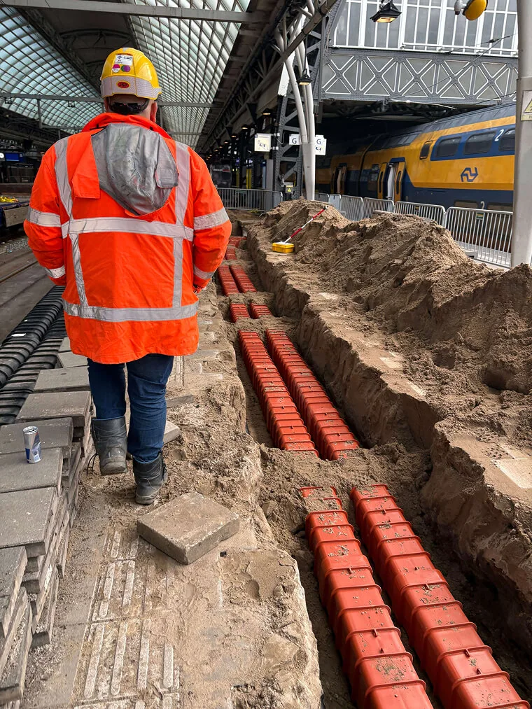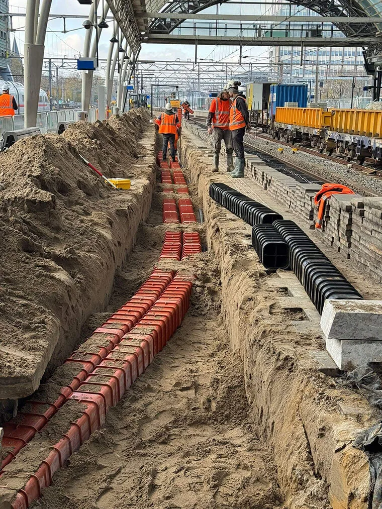 Voor de aanleg van een toekomstbestendig kabeltracé onder het perron van Amsterdam Centraal koos uitvoerder Dura Vermeer voor onze Utilis Multikokers. Deze oplossing bundelde maar liefst 160 soorten kabels van sein- en wisselkabels tot communicatie- en voedingslijnen in één robuust systeem. Dankzij de hoge schedeldruk (SN140) bleven de kabels optimaal beschermd, terwijl het systeem uitbreiding of vervanging mogelijk maakte zonder ingrijpende werkzaamheden. Zo werd een duurzame oplossing gerealiseerd die bijdroeg aan betrouwbare mobiliteit en minimale overlast voor reizigers.