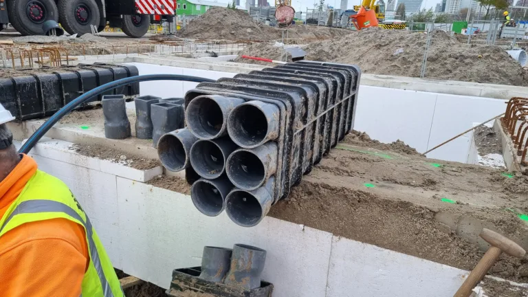 Pour la construction d'un chemin de câbles à l'épreuve du temps sous la plate-forme de la gare centrale d'Amsterdam, l'entrepreneur Dura Vermeer a choisi nos Utilis Multicokers. Ce système permet de regrouper environ 160 types de câbles, depuis les câbles de signalisation et de commutation jusqu'aux lignes de communication et d'énergie. Grâce à la pression élevée de la gaine (SN140), les câbles restent protégés de manière optimale, tandis que le système permet une extension ou un remplacement sans travaux majeurs. Il s'agit donc d'une solution durable qui contribue à une mobilité fiable et à une gêne minimale pour les voyageurs.